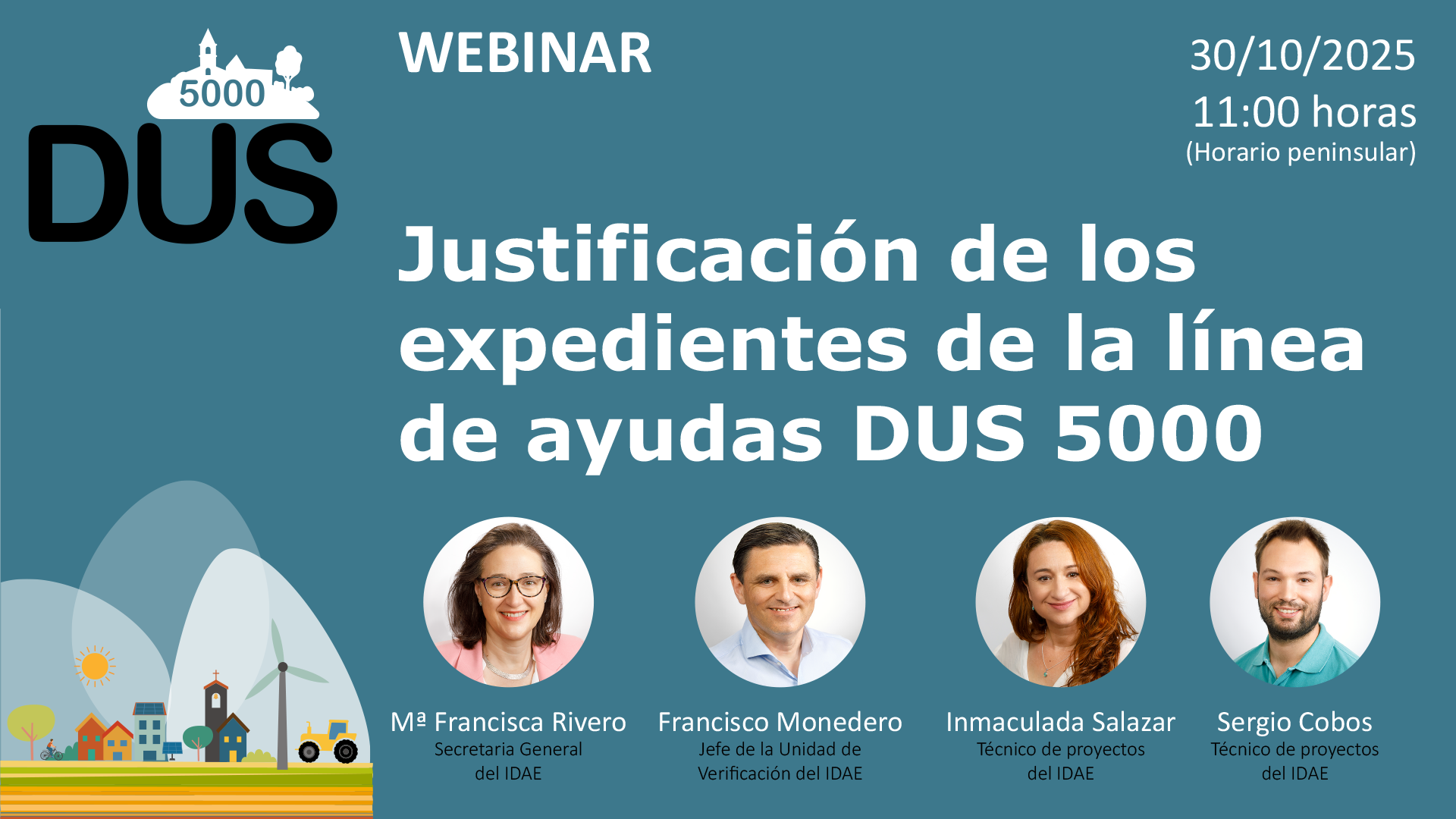 Te invitamos a participar en el WEBINAR sobre JUSTIFICACIÓN DE LOS EXPEDIENTES DE LA LÍNEA DE AYUDAS DUS 5000 del IDAE, en el marco del Plan de Recuperación, Transformación y Resiliencia, financiado por la Unión Europea – NextGenerationEU, que se celebrará el 30 de octubre a las 11:00 horas (horario peninsular)